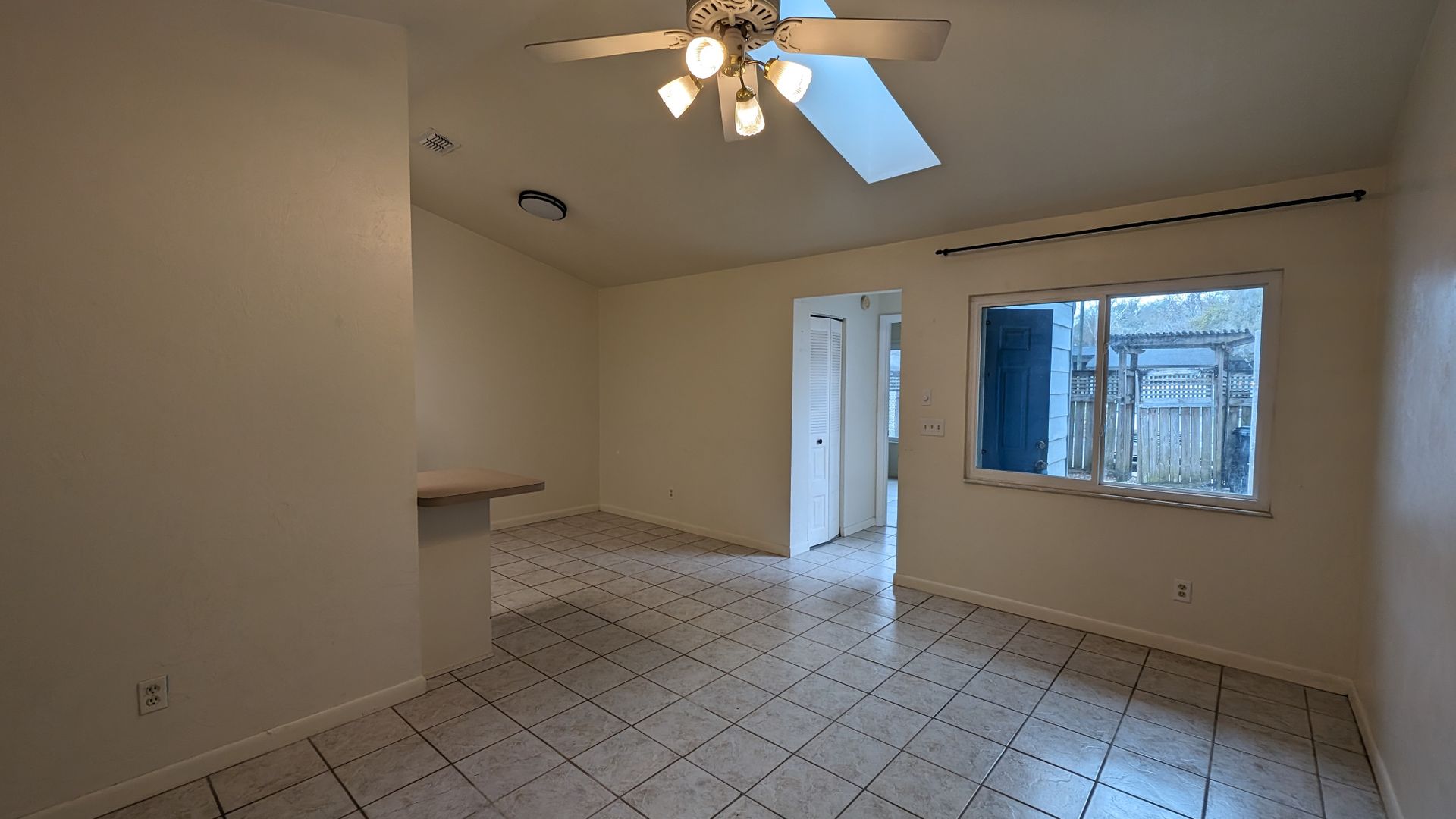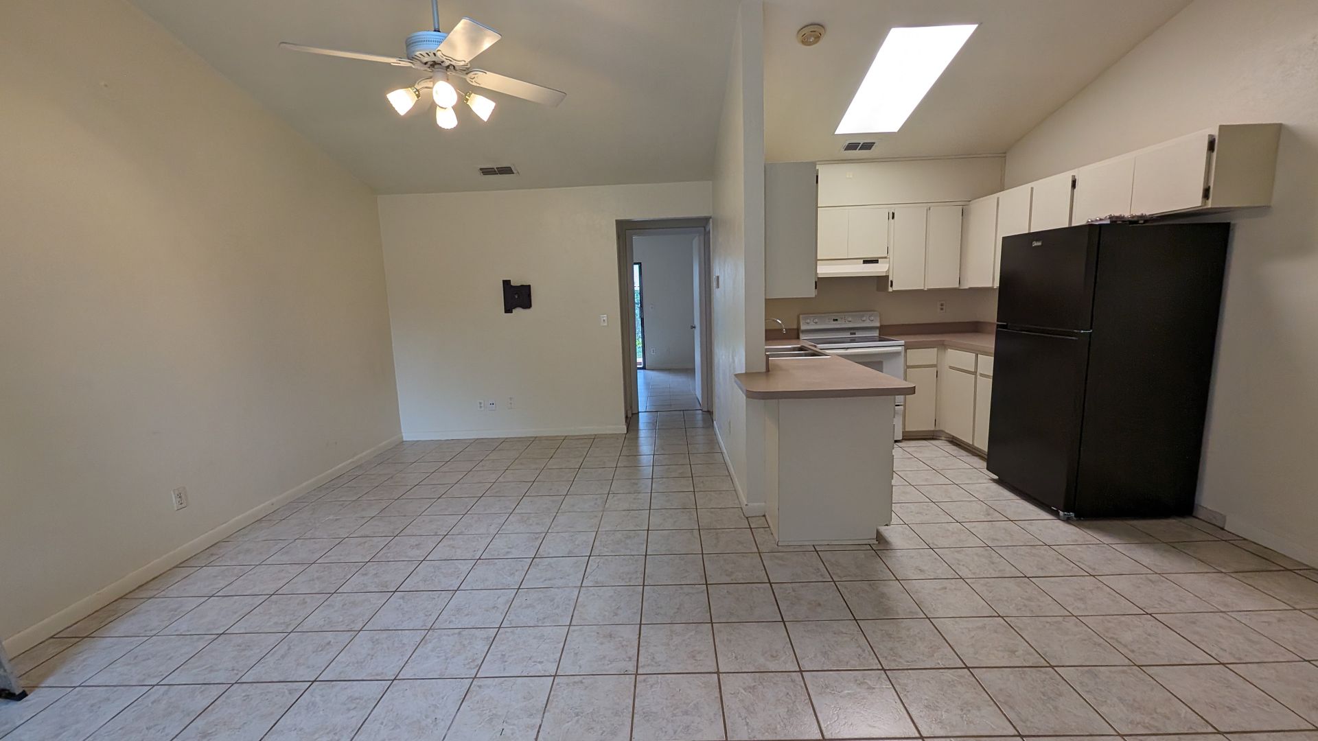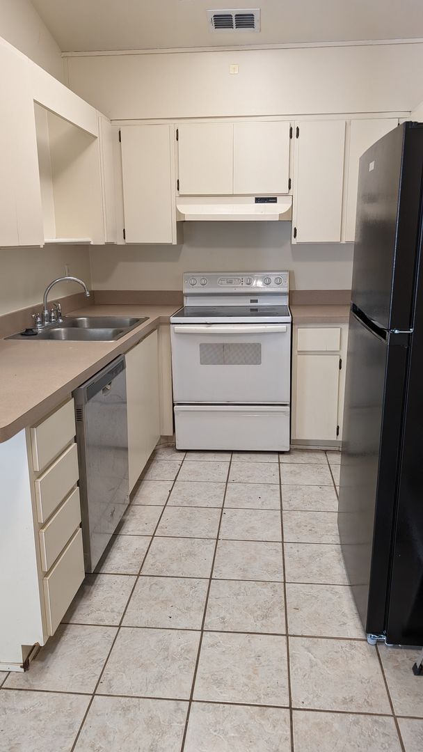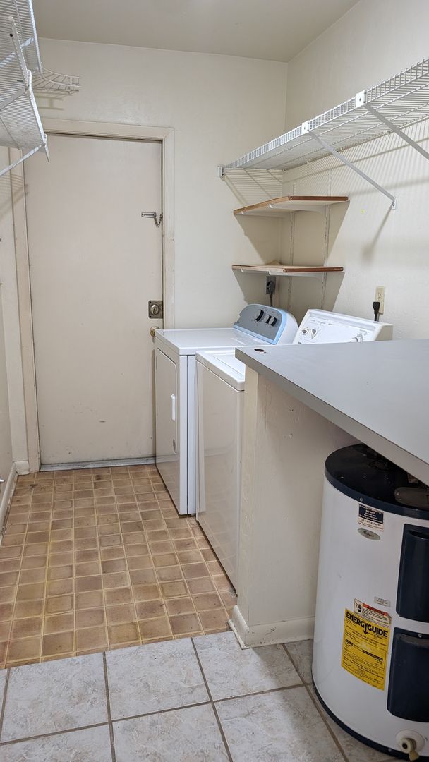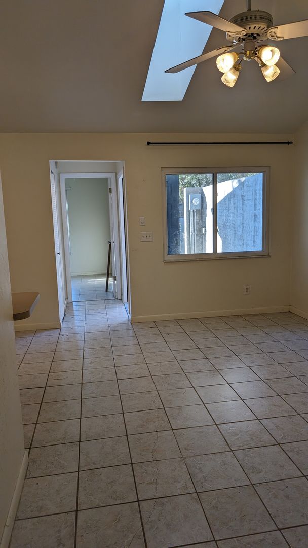 This 2 bedroom/1 bath unit has vaulted ceilings, big front windows and a skylight which combine for a very light and bright atmosphere. No Carpets!! Tile throughout means low maintenance floor cleaning. The kitchen is equipped with all appliances including a brand new refrigerator installed 2-2024. A bedroom at the front of the unit and a bedroom at the back of the unit share a large bathroom with tub/shower. A separate laundry area is located off of the bathroom and is outfitted with a washer and brand new dryer installed 2-2024 --no trips to the laundromat!!