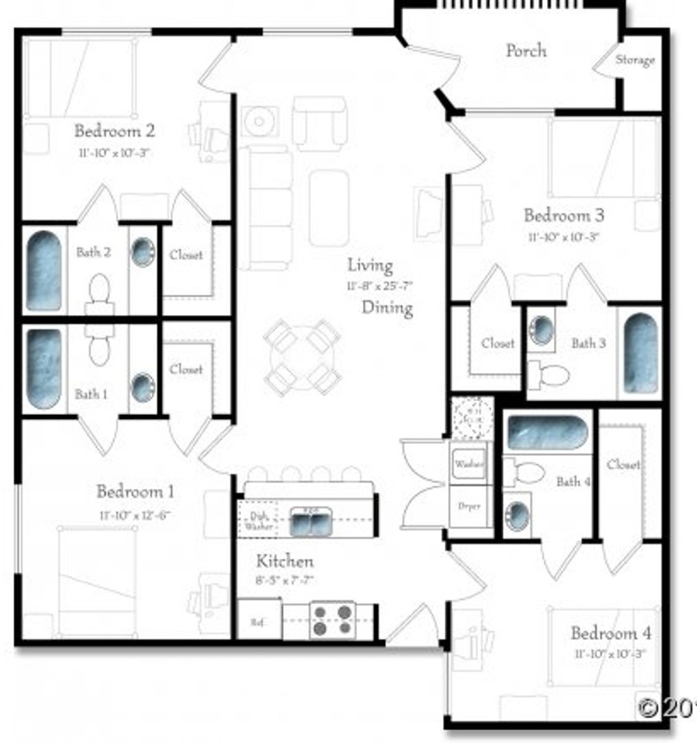 Welcome to Countryside at the University 3-304. This unit accommodates single tenants for shared housing in a 4 bedroom, 4 bathroom, 3rd floor level unit located less than a mile from the University of Florida. These units have an open plan with kitchen and breakfast bar that opens to a living room and dining room with a covered balcony off the living area. In each corner of the unit is a bedroom with a private bathroom and walk-in closet. The kitchen is outfitted with a refrigerator, stove with oven, microwave and a dishwasher. The closet off the living room is equipped with a washer and dryer.