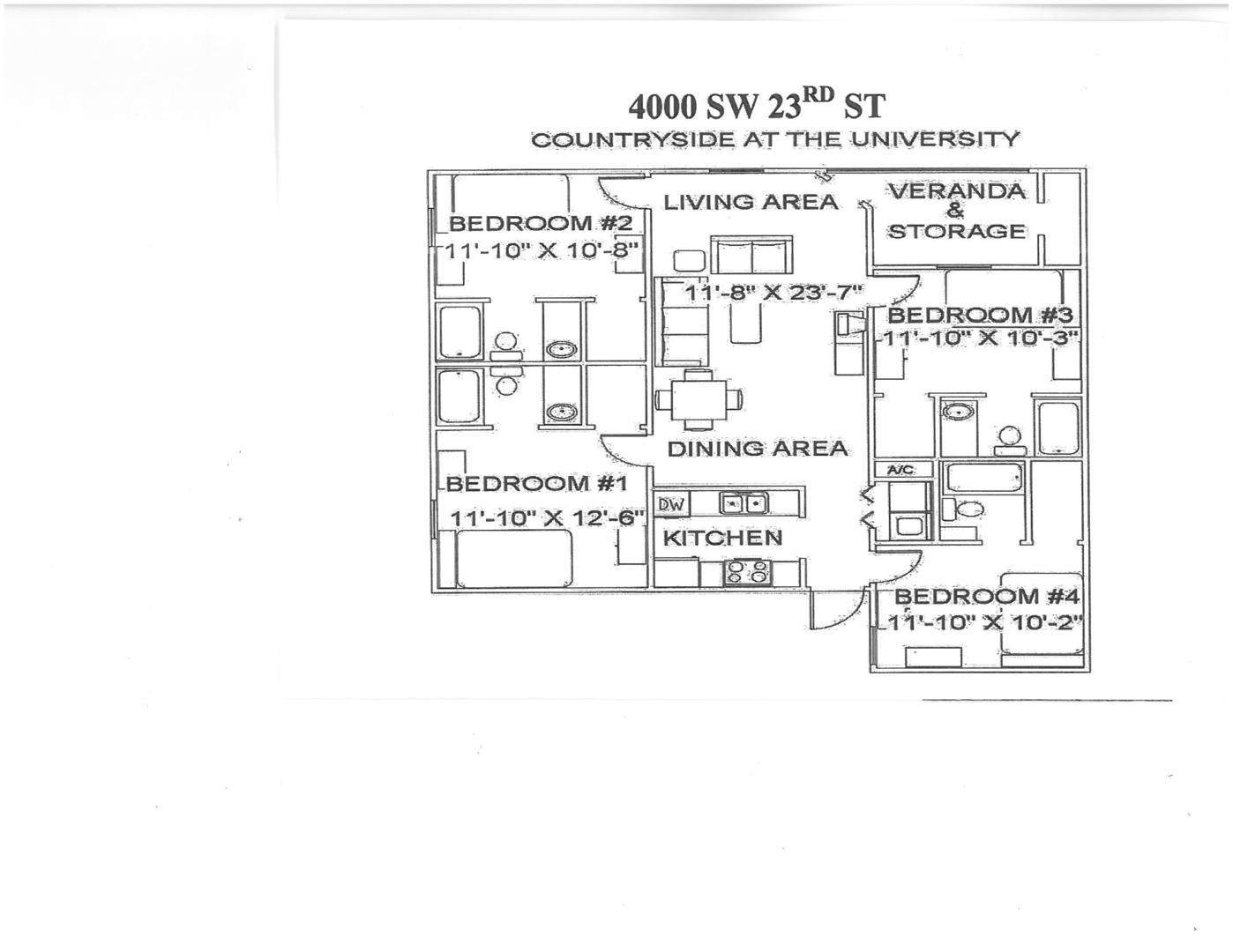 4 bed/4 bath condo within 2 miles of University of Florida, Shands, Butler Plaza shopping. Condo has carpet in bedrooms and simulated wood flooring in living/dining area. There is an open, covered porch with private view. Each bedroom has a walk-in closet and a private bath. The community features pool, exercise room, basketball court, sand volleyball court, and hot tub. The condo is also on direct bus routes to UF. Move In Ready! Unit is completely furnished.